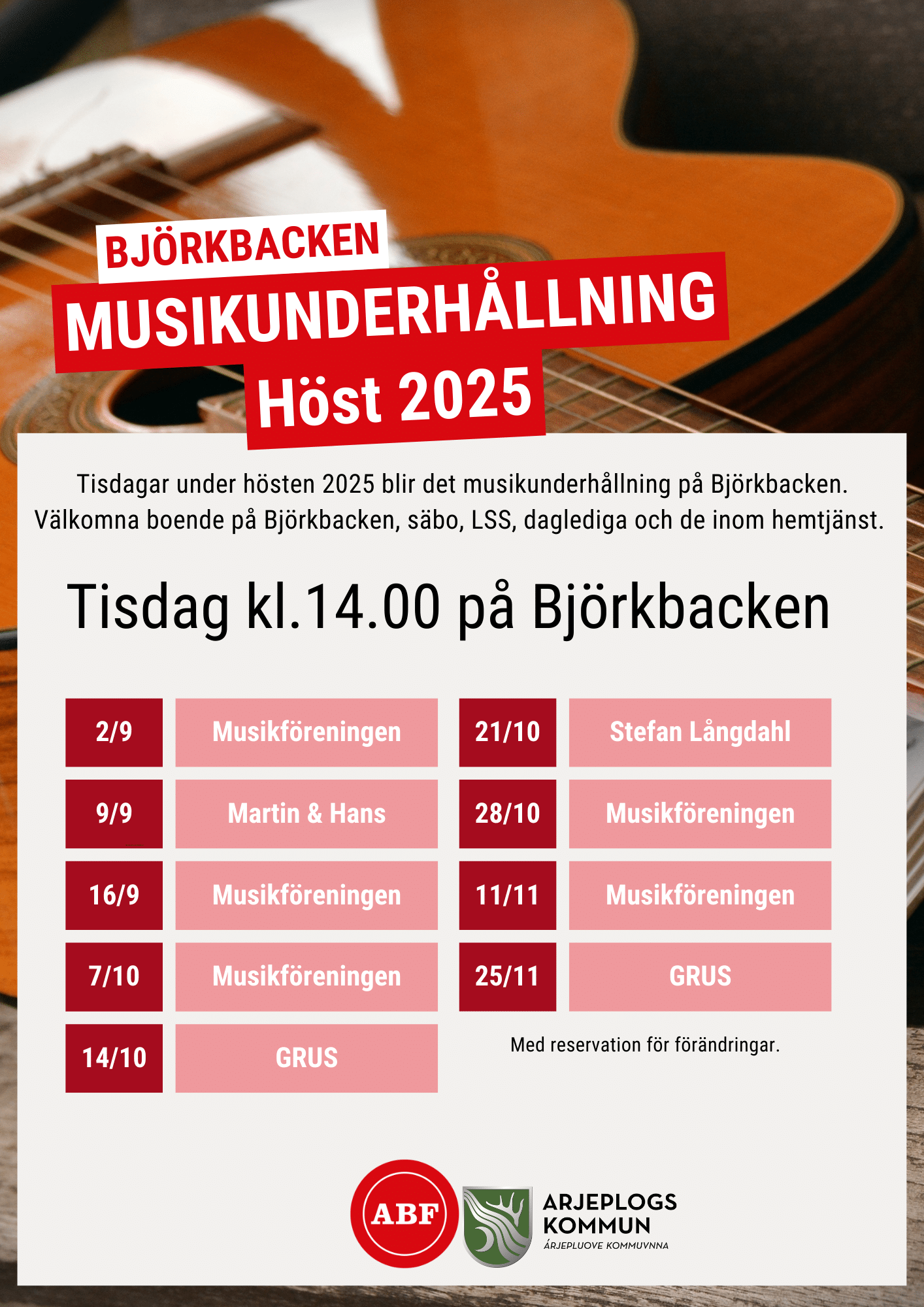 Tisdagar under hösten 2025 blir det musikunderhållning på Björkbacken. Välkomna boende på Björkbacken, säbo, LSS, daglediga och de inom hemtjänst.